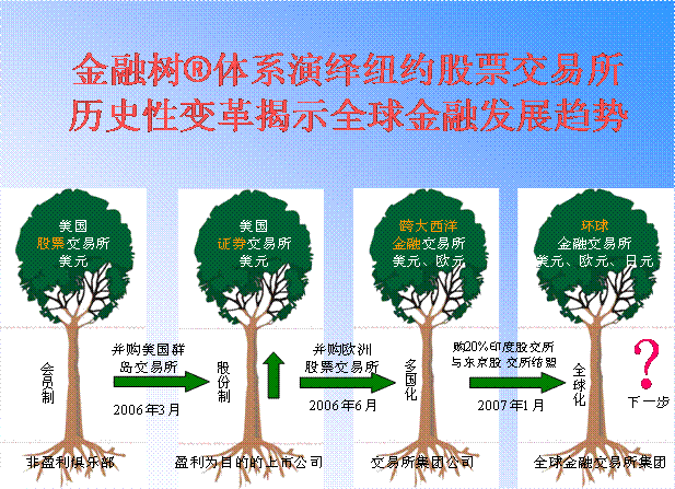 尽管纽约股票交易所不是第一个由非盈利会员制俱乐部转变为一个以盈利为目的的股份制有限公司,尽管纽约股票交易所不是第一个由股票交易所向证券交易所转型的公司,但由于它在国际金融市场的独特地位、规模和影响,这一历史性事件将作为纽约股票交易所和整个行业的里程碑永久载入华尔街及国际金融发展的史册。表面上看,这是一次孤立的偶然事件,但任何新事物的出现必须有与其适应的环境,因此,它实质上是整个行业及其环境变化的结果,不仅揭示了国际资本市场的根本性变化,勾勒出未来国际资本市场竞争的新格局,而且预示着未来国际金融的发展方向。